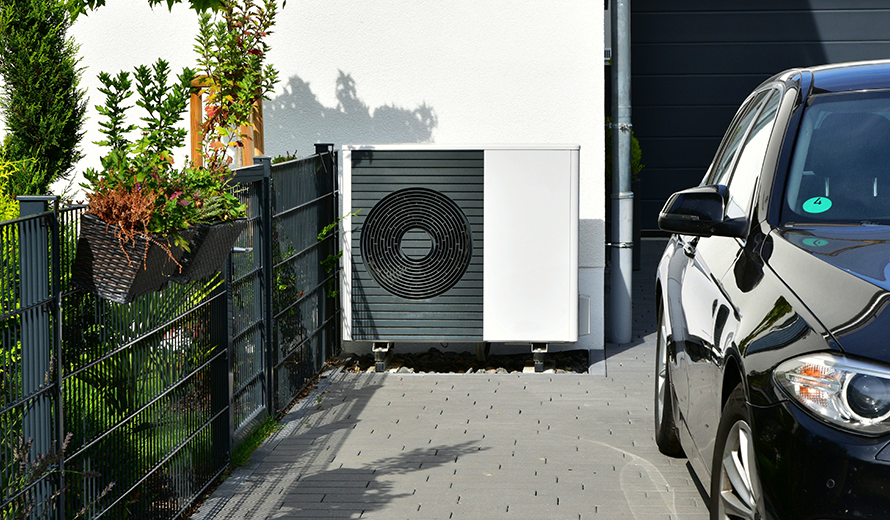 Geschickt platziert fügt sich eine Wärmepumpe beinahe unsichtbar ans Haus an.