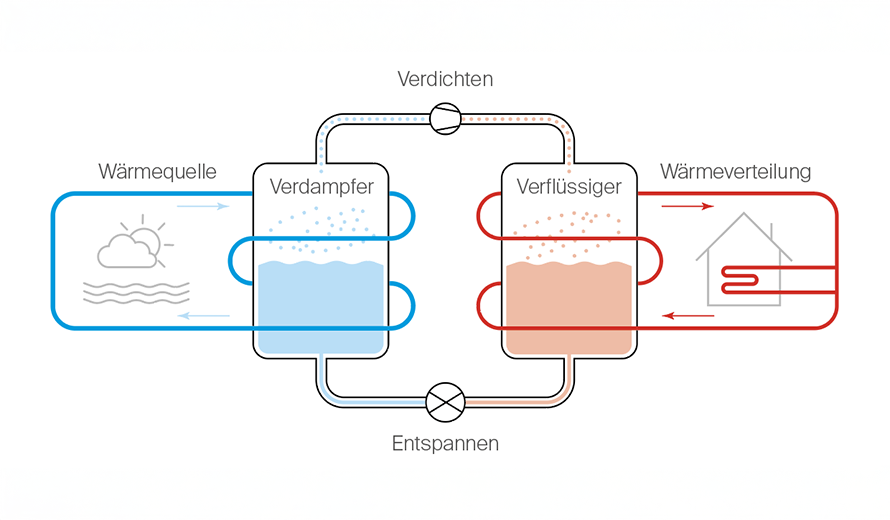 Kreislauf der Wärmepumpe: Verdampfen, Verdichten, Verflüssigen, Entspannen.