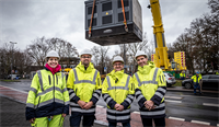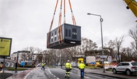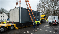 Scheinbar schwerelos schwebt ein 56 Tonnen schweres Gebäudeteil über die Philipp Reis Straße im Kölner Stadtteil Porz. Es ist etwa so groß wie eine Garage und hängt an einem Mobilkran der 650 Tonnen Klasse mit einer Ausladung von rund 25 Metern. Zentimeter für Zentimeter senkt der Kran die Station an ihren vorgesehenen Standort ab.