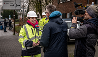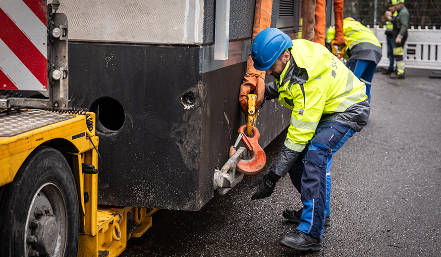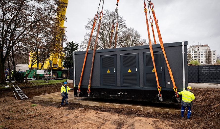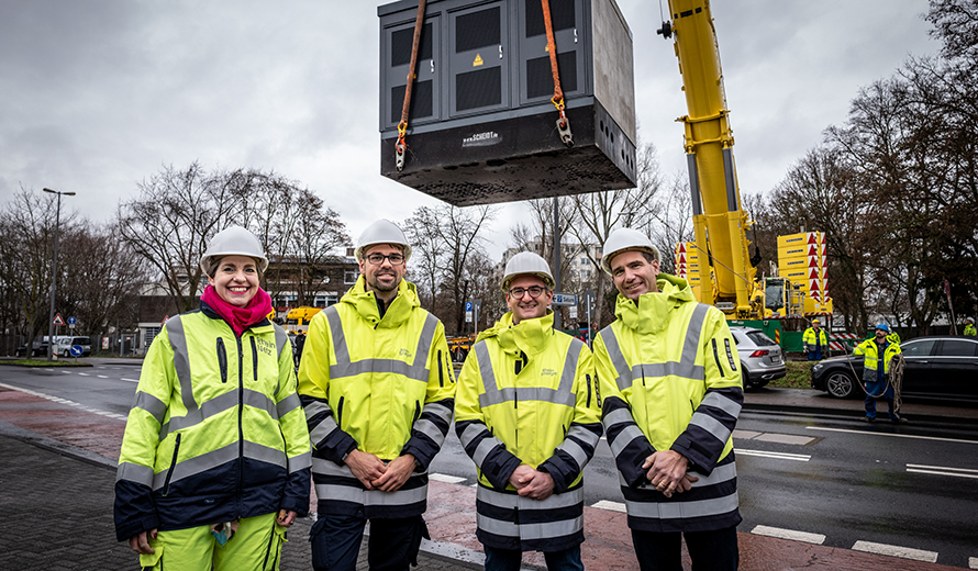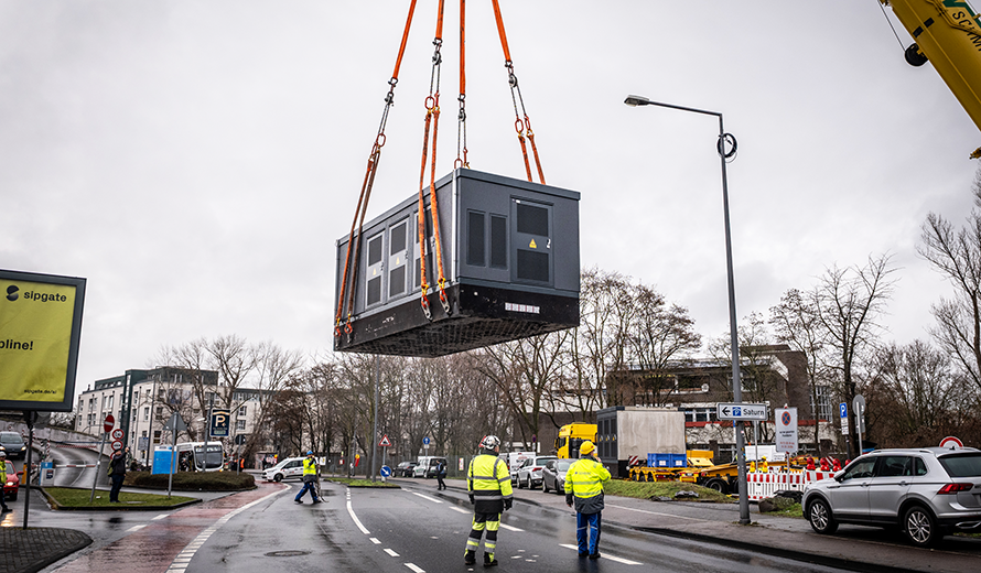 Jonas Kohlstädt beobachtet die Arbeiten aus sicherer Entfernung. Der Projektleiter der RheinNetz hat den Aufbau über Monate hinweg geplant und vorbereitet. Nun ist er erleichtert, dass alles reibungslos verläuft. „Die Platzverhältnisse vor Ort sind sehr eng, zudem stehen Bäume im Weg. Da ist höchste Präzision gefragt“, sagt Kohlstädt. Spezialkräfte einer beauftragten Fachfirma sorgen dafür, dass die Station millimetergenau positioniert wird. Kurz darauf folgt der zweite Gebäudeteil, der weitere 36 Tonnen wiegt. Zusammen bilden sie eine neue Transformatoren und Gleichrichterstation für die Stromversorgung der Schnellladestationen für Elektrobusse der Kölner Verkehrs Betriebe (KVB).